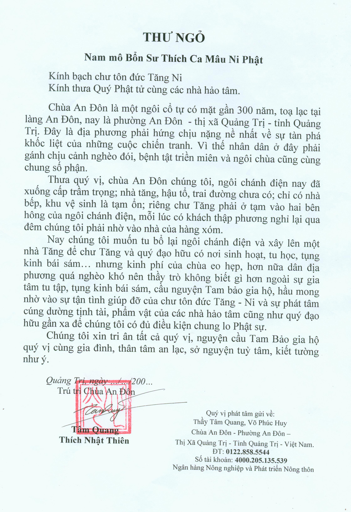 Địa chỉ gởi thư: Tu Viện Quảng Đức, 105 Lynch Road, Fawkner, Vic. 3060. Tel: 61. 03. 9357 3544